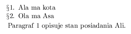 \makeatletter \def\p@enumi{\S} \makeatother \renewcommand{\labelenumi}{\S\theenumi.} \begin{enumerate} \item Ala ma kota\label{ala} \item Ola ma Asa \end{enumerate} Paragraf \ref{ala} opisuje stan posiadania Ali.